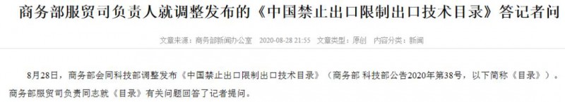 8月28日21:30分,商務部、科技部官網(wǎng)幾乎同時刊發(fā)關(guān)于調(diào)整發(fā)布《中國禁止出口限制出口技術(shù)目錄》的公告。
