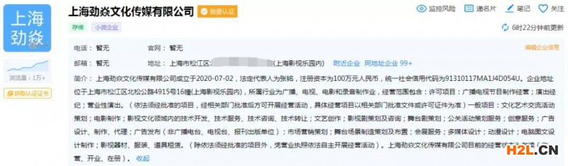 據了解,上海勁焱文化傳媒有限公司成立于2020年7月,法定代表人為張銘,注冊資本100萬元人民幣,經營范圍含廣播電視節目制作經營;演出經紀;營業性演出等。天眼查App股東信息顯示,該公司第一大股東為周深,持股比例為95%。