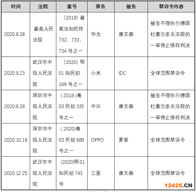 在近年的幾起知識產權案件中,中國法院認為專利訴訟的當事人向外國法院申請禁令或禁訴令對國內當事人的訴訟利益和中國法院的管轄權將產生沖擊。為了反制域外法院的禁令或禁訴令,中國法院在知識產權領域共頒布了如下表所示5件跨國或全球禁訴令,全部涉及通信領域SEP專利許可費率糾紛。需要注意的是,最高法院審理的華為v.康文森案和深圳中院審理的中興v.康文森案系中國境內SEP許可條件糾紛,禁訴令的范圍僅包括康文森不得執行德國法院的一審判決,并非真正意義上的全球禁訴令。