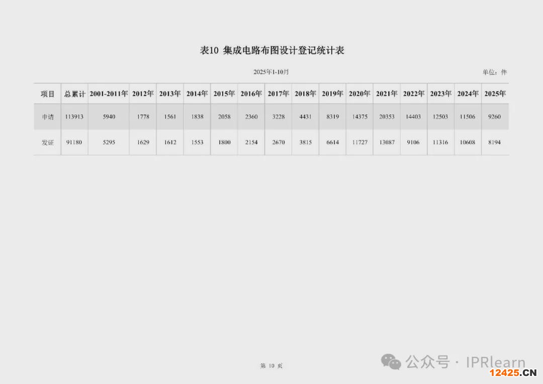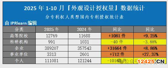 根據國知局公布的月報(分專利權人類型國內專利授權統計表)2025年1-10月外觀設計授權量與去年同比: