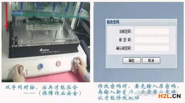 借用二個以上的動作必需 共同或依序執行才能完成工作,以前聽現場的老師傅說過,10個沖壓工9個殘,很多在沖壓過程中手或者手指沒有及時拿出來,造成傷殘,下圖顯示了只有當兩只手同時按按鈕,設備才能工作(壓下來)。如果再在模具下面加一個光柵保護,可以實現雙保險。
