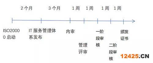 通常在IT服務管理體系發布實施3個月后才能進行第三方機構正式審核。一般情況下企業從啟動ISO20000項目到獲得證書大概6個月左右即可,大概的時間分布如下圖所示: